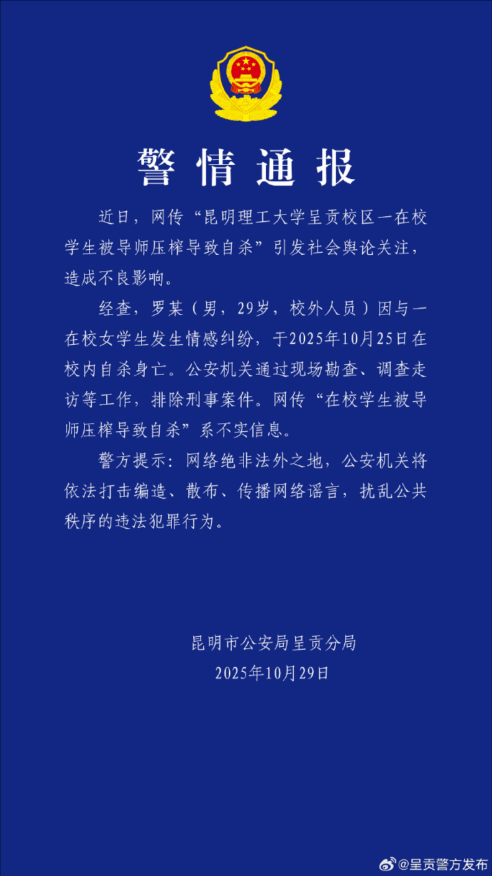 央视网消息:据@成功警察微博消息,昆明市公安局呈贡分局10月29日报道,近日,网上流传昆明理工大学呈贡校区一名学生被监护人勒死自杀的谣言,引发社会关注并产生负面影响。经查,罗先生(男,29岁,校外)因在学校与女学生发生感情纠纷,于2025年10月25日自杀。公安机关通过现场检查、挨家挨户侦查消除刑事案件。 “小学生被家教利用后自杀”是网上流传的错误信息。